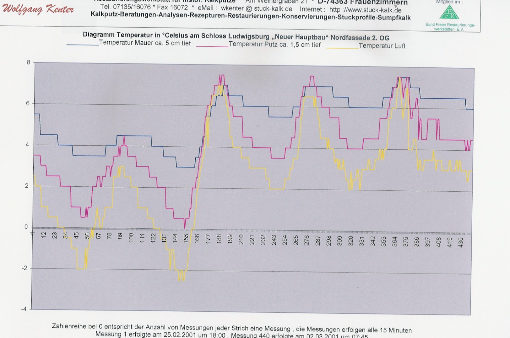 Bei diesen Messungen zeigte sich eine sehr interessante Temperaturkurve, zwischen den Messungen Nr. 144 und 155 sank die Lufttemperatur bis Minus 2,5°, die Temeperatur des Putzes war hier im Durchschnitt bei ca. +0,5° und die Temperatur der Mauer in 5cm Tiefe lag bei ca. +3°. Beim hochgehen der Lufttemperatur bis ca. +7° zogen in gleicher Kurve sowohl das Mauerwerk als auch der Putz bis +7° mit, der Putz sogar 0,5° höher.